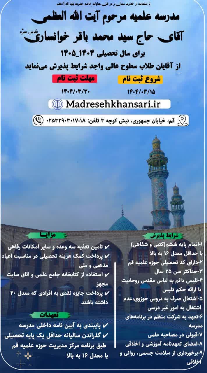 مدرسه علمیه آیت الله العظمی حاج سید محمدباقر خوانساری(قدس سره) برای سال تحصیلی 1404-1405 از طلاب برادر سطوح عالی واجد شرایط پذیرش مینماید.